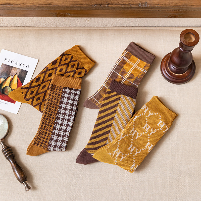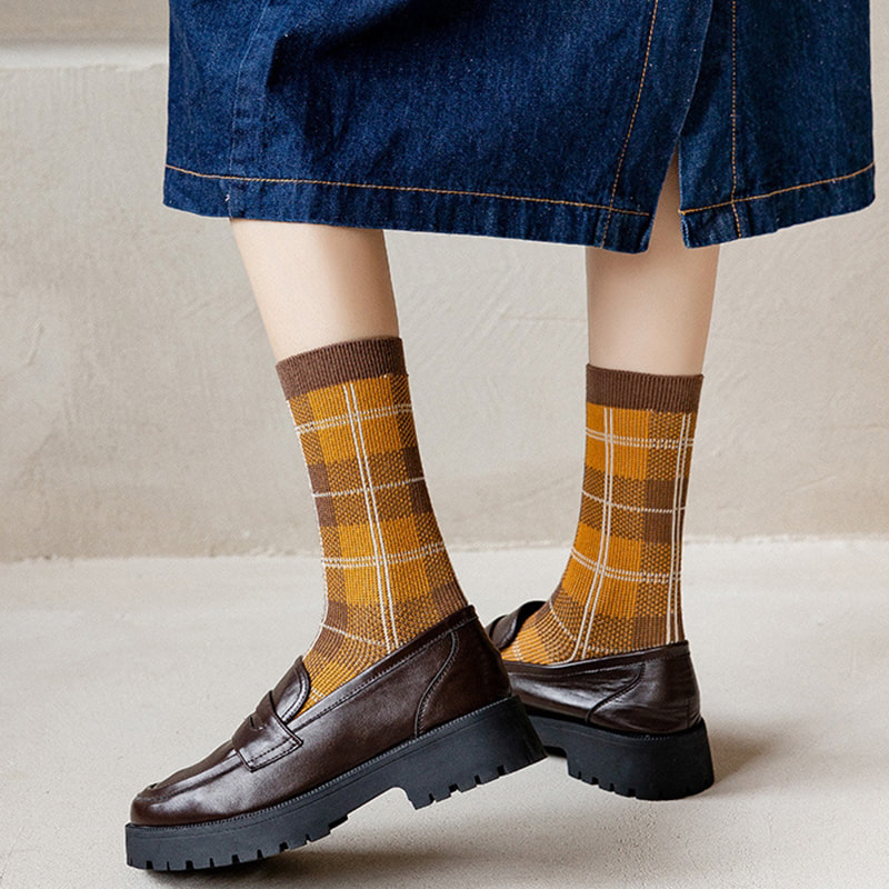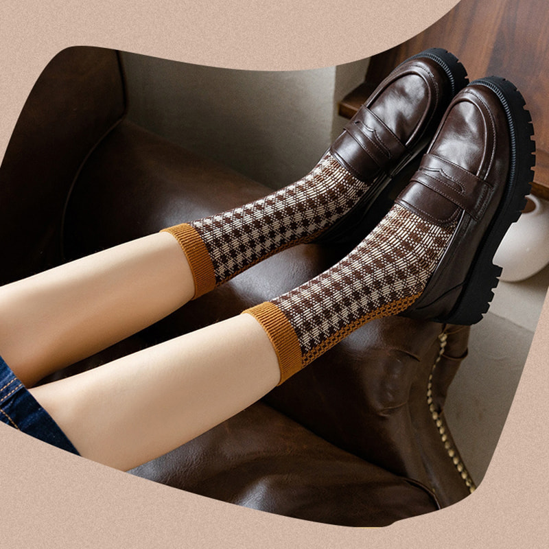Bruken av italiensk retro dobbel nål dobbel vevingsteknologi gjør sokkestrukturen mer kompakt, reduserer overflødig tråd ender, forbedrer det generelle håndverket og komforten, og øker ikke bare holdbarheten til sokkene, men gjør også sokkene mer i tråd med fotformen, og gir bedre støtte og innpakning. Bomullstoff av høy kvalitet velges vanligvis, med god pusteevne og fuktighetsabsorpsjon, som kan holde føttene tørre og komfortable, og redusere fots svette og lukt. De indre og ytre stoffene på sokkene er alle bomull, noe som sikrer at delen i kontakt med huden er myk og behagelig. Kombinasjonen av rutete og leopardtrykk beholder ikke bare den klassiske og enkle stilen til pledd, men tilfører også villheten og mote for leopardtrykk, noe